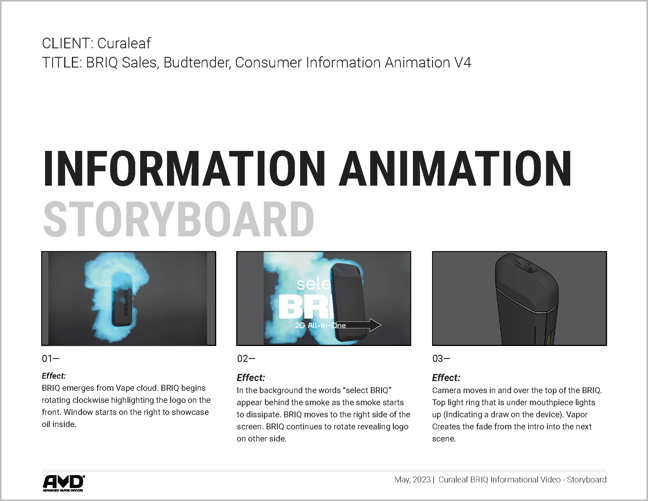 Full campaign from storyboard to showroom floor. I developed the storyboard and worked with a renderer to produce the launch video, which ran online and in dispensaries across the market. The centerpiece was the "Not Just Another Brick in the Wall" concept, a Pink Floyd spoof developed between me and the VP of Marketing, built on the idea that BRIQ wasn't like anything else out there. All of the event display artwork was mine, including the Pink Floyd-inspired graphics. I collaborated with our vendor on the hole-in-the-wall installation and worked directly with our factory in China to produce the three-dimensional light-up device.